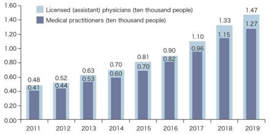 At present, the training system of rehabilitation assistive talents in China is not perfect, the number of employees is insufficient, and the title system is basically blank. There is an urgent need to strengthen the construction of the talent team and solve the talent bottleneck problem that has restricted career development for a long time [58]. As shown in Figure 4, the total number of rehabilitation practitioners is insufficient. In 2019, there were 14,700 licensed (assistant) doctors in the rehabilitation hospitals, including 12,700 licensed doctors. The innovative research and development of rehabilitation assistive devices requires interdisciplinary talents, while the training of rehabilitation assistive device-related professionals in China is weak. Many first-class universities in the United States, Japan and other developed countries have set up rehabilitation engineering majors to cultivate doctoral-level talents, while only a few universities in China have set up a rehabilitation engineering direction with a major in biomedical engineering.