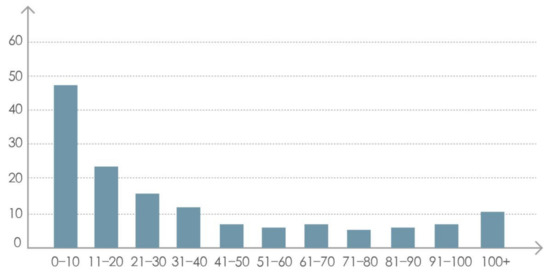 The rehabilitation assistive equipment industry emphasizes high levels of technology, and its business relies on high-end talents. It relies on the service industry developed by the cooperation of information technology, life science, material science, ergonomics and other disciplines, and it is technology-intensive [61]. As shown in Figure 5, according to the “Tianyancha” business query platform and online research materials, 138 large-scale rehabilitation assistive enterprises were analyzed in this study. It can be seen from the figure that the largest number of enterprises have 0–10 patents, while those of the second largest number have 50–100 patents. In general, China’s auxiliary appliance industry has a weak foundation and lags behind in scientific and technological innovation. There are some problems, such as an incomplete industrial chain, insufficient product categories, low product quality, low market share of domestic medium- and high-end products, lack of independent intellectual property rights in key parts, control chips, core algorithms and other core technologies, and some medium- and low-end auxiliary products are mainly imitations and OEMs for foreign enterprises.