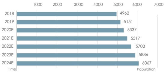 With the continuous growth of China’s economic aggregate and domestic demand, the rehabilitation assistive device industry has entered a period of rapid expansion. With the acceleration of the aging process of China’s population, the seventh population census showed that the proportion of the population aged 65 and above in China’s total population has reached 13.5%. It is expected to increase to 20% in 2033 [63], entering the stage of severe aging. With the growing scale and proportion of the elderly disabled population in China, the burden of disability is increasing [64]. As shown in Figure 6, it is predicted that the number of elderly people aged 60 and above in need of rehabilitation treatment will be 60.67 million in 2024.