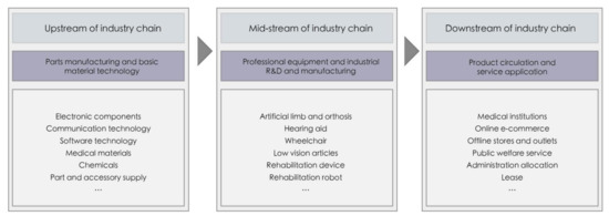 The industry chain of rehabilitation assistive devices is mainly divided into three parts: (1) upstream of the industry chain—parts manufacturing and basic material technology; (2) mid-stream of the industry chain—professional equipment and industrial R&D and manufacturing; (3) downstream of the industry chain—product circulation and service application, as shown in Figure 7.