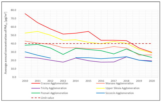 Average annual concentration of PM10 [µg/m3] in selected Polish agglomerations. Source: Statistics Poland.