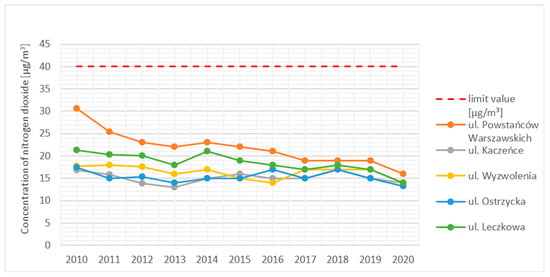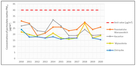 Compared to 2010, 2020 showed a reduction in the average annual concentration of NO2 and PM10 (Figure 3 and Figure 4), which resulted in improved air quality in the described region. Despite this positive trend, many problems require quick and more determined action. These include high emissions of pollutants from individual heating systems as well as emissions from road traffic, a small share of renewable energy sources, high noise intensity from road traffic, an increase in the number of means of transport, an increase in electromagnetic field levels, and the still low level of environmental awareness among the general population.