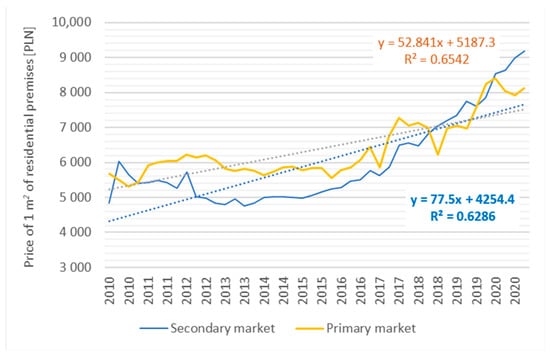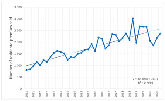 In terms of social factors influencing demand in the residential premises market, there can be mentioned migrations, demographic factors, settlement preferences, and patterns of social life. The specificity of the described real estate market sector lies in the fact that the demand fluctuates while the supply is rigid due to the limited land resources, limited number of premises in the near-term period, and regulatory reasons [42]. Furthermore, factors influencing supply and demand interact with variable intensity in given periods of time. Another characteristic of the residential premise’s market is, therefore, seasonality.