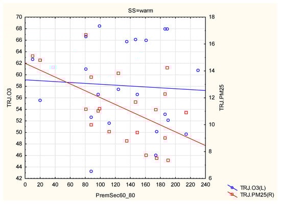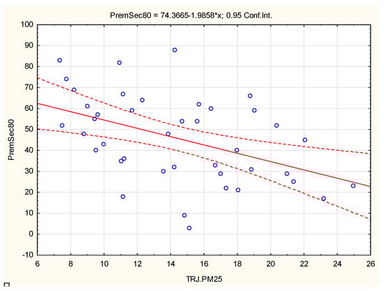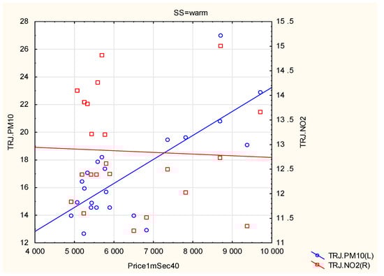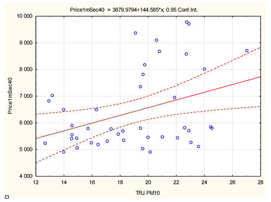 The obtained results (Table 4) indicate that PM2.5 concentrations are related (p ≤ 0.05) to the number of sales of large flats above 80 m2 on the secondary market (PremSec80 = −0.45) and PM10 with prices for 1 m2 of small flats, i.e., up to 40 m2 in the secondary market (Price1mSec40 = 0.31).