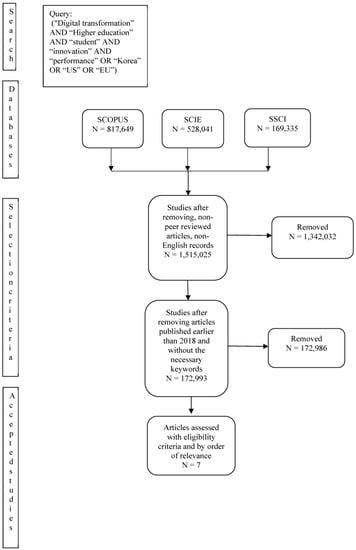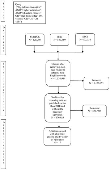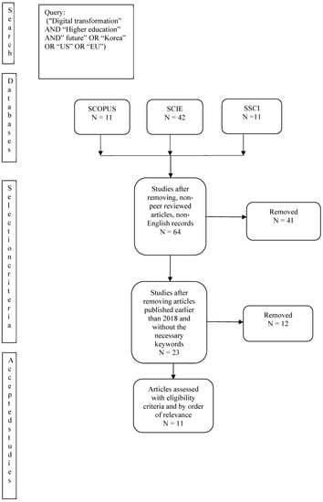 The methodology used in this study is qualitative. It entails a mix of a systematic review of literature and a bibliometric analysis. A systematic literature review is a methodology that is suitable when the aim of a study is to synthesize the knowledge in existing studies on a subject matter [9]. This study falls into this category; hence, the adoption of this methodology is right. Furthermore, studies considering the relationship between the digital transformation of the advanced technologies of the fourth industrial revolution, and the higher education system are scarce. Hence, a review of extant literature is the most appropriate method for collecting information. While there are various guidelines for performing a systematic literature review, the Preferred Reporting Items for Systematic Reviews and Meta-Analyses (PRISMA) 2020 guideline is one of the favorites of researchers.