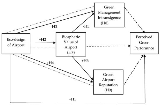 The primary purpose of this current investigation is to probe the effect of the relationship between the eco-design of airport buildings (EAB), biospheric value (BV), green management intransigence (GMI), and green airport reputations (GAR) on perceived green performance (PGP). In addition, the study examines the mediating roles of BV, GMI, and GAR on PGP. Thus, this study intends to answer the following research questions; (1) How does the relationship between green management intransigence, eco-design of airport buildings, the biospheric value of airport management/employees, and green airport reputation affect perceived green performance? (2) Do the biospheric value of airports’ management/employees, green airport reputation, and green management intransigence have mediating roles on the effect of eco-design of airports on perceived green performance?