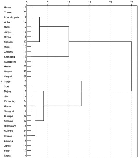 From the above factor analysis, we obtained the comprehensive scores of each province. To further understand the differences in the level of rural industrial integration development between the regions in China, we used cluster analysis to stratify the provinces and municipalities, which is helpful in proposing the targeted development strategies for each level.