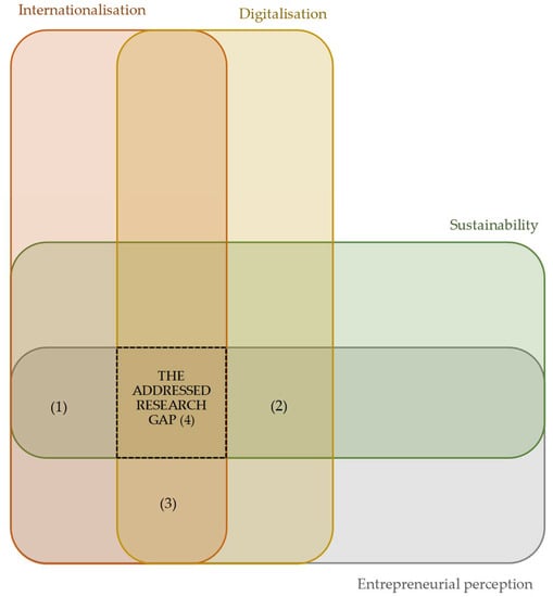 The present research was designed as an interdisciplinary study where the conceptual model integrates different theoretical frameworks and, as such, it crosses the boundaries of internationalisation, digitalisation, entrepreneurial perception, and sustainability research. By reviewing previous literature on these disciplines, some research gaps can be noticed in their cross-sections: the complex relationships between internationalisation, sustainability and entrepreneurial perception (1), digitalisation, sustainability and entrepreneurial perception (2), internationalisation, digitalisation and entrepreneurial perception (3) and digitalisation, internationalisation, sustainability and entrepreneurial perception (4) have not been studied yet (Figure 1). This article addresses the latter gap (4).