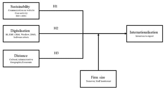 In particular, our research is based on the assumption that the firm’s stand on sustainable production, its level of digitalisation, its cultural background, and ultimately its size all together determine whether the firm actively engages in internationalisation. Accordingly, our research model is presented in Figure 2. We have considered firm size measured by turnover and staff headcount as a control variable, following prior studies on the internationalisation of SMEs [84,85,86,87].