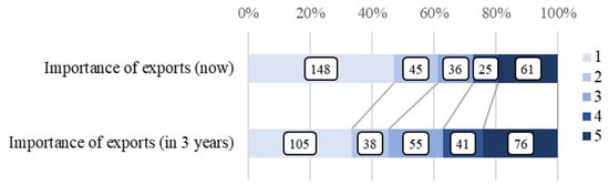 Dependent variable: intention to export by relying on the work of Sommer [52] and Jaffe [57]. According to the definition of Reid [60], our research, by using the question of “How important are exports going to be for the company in 3 years’ time?”, focuses on the export dimensions of belief and expectancy. The variable was measured on a Likert scale, ranging from 1 (not important at all) to 5 (very important).