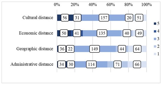 The perceived distance between the home country and the destination country is defined as “[…] the set of factors that prevent or interfere with the flow of information between the firm and the market” [125] (p. 308). According to the Uppsala model, firms tend to prefer countries with a close, i.e., within a small distance when they start operating abroad and only then expand into markets in distant countries [125]. This reasoning is related to the assumption that in countries within a smaller distance, the economic, social and cultural conditions are easier to understand and thus business operations are easier to carry out.