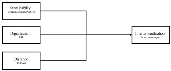 The growth of organisations has long been at the centre of researchers’ attention. There are many aspects to growth. Sustainability and digitalisation have been considered the most popular topics in recent years, while entrepreneurial perception and internationalisation are evergreen topics in this area. Many researchers have studied the internationalisation of companies, more specifically micro, small and medium-sized enterprises (hereinafter referred to as SMEs) [1,2,3,4,5,6,7,8,9,10], and the role of entrepreneurial perceptions in this process, and a large number of studies have been carried out on the use of digital business technologies and their benefits for SMEs [11,12,13,14,15,16]. The effect of sustainability has also been widely researched [17,18,19,20,21,22]—it has even been linked to digitalisation previously [23,24,25,26]. It is important to study the internationalisation of SMEs via a dual approach by focusing on the effect of both sustainable behaviour and digitalisation on exports. Traditionally, local production is considered to be environmentally, socially and economically sustainable [27,28,29,30,31], however, digitalisation can help local businesses to enlarge their market in a sustainable way [30] and overcome geographical barriers.