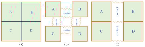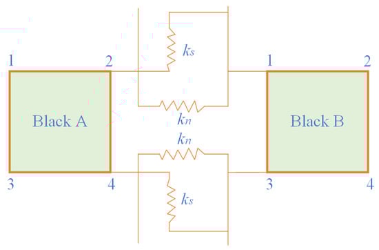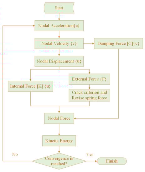 The calculation domain is discretized into continuous elements, discontinuous elements and partially continuous elements in numerical calculation, which, respectively, correspond to the finite element method (FEM) domain, discrete element method (DEM) domain and continuum–discontinuum element method (CDEM) domain, as shown in Figure 3. FEM is applicable to completely continuous problems, and DEM is applicable to completely discontinuous problems. CDEM carries out finite element calculation inside the block and discrete element calculation at the boundary, which is mainly used to simulate the progressive failure process of rock–soil mass from continuous medium to discontinuous medium []. The contact relationship of the numerical model is shown in Figure 4. The block is composed of one or more finite element elements, which are used to characterize the continuous properties of materials such as elasticity, plasticity and damage. The common boundary between the two blocks is the interface, which is used to characterize the discontinuous properties of materials such as fracture, slip and collision. The block is composed of finite elements to characterize the continuous characteristics of rock. The characteristic of CDEM is that it can simulate the initiation, propagation and connection of explicit cracks in materials while simulating the elastic–plastic deformation of materials. Interfaces in CDEM include two concepts: real interface and virtual interface. The real interface is used to represent the interface, fault, joint and other real discontinuous surfaces of materials, and its strength parameters are consistent with those of the real interface. The virtual interface mainly has two functions []: (1) connect two blocks for transferring mechanical information; (2) provide a potential channel for the propagation of explicit cracks (that is, cracks can propagate along any virtual interface). In the modeling process, the MC model is adopted for the element, and the brittle fracture model based on MC criteria is adopted for the contact. Considering the difference between rocks and between layers, the contact parameters between bedding are smaller than those within rocks. The schematic diagram of CDEM calculation process is shown in Figure 5.
