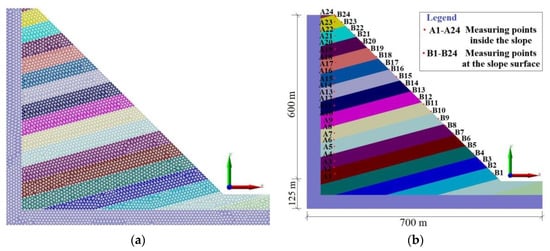 Numerical model and measuring points layout of the anti-dip slope: (a) model mesh; (b) measuring points.