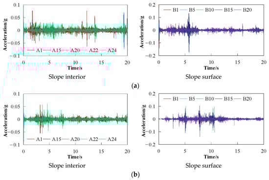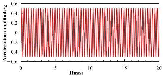 The numerical model of the slope is shown in Figure 6. The layout scheme of monitoring points in the model is shown in Figure 6b. Sinusoidal waves are loaded at the bottom of the model slopes to simulate ground motion. The slopes are 725 m high and 700 m long. In numerical simulation, viscous boundary was used at the bottom of the models and free field was used at both sides of the models to eliminate the adverse influence of boundary conditions. The direction displacement at the bottom of the models is fixed. The acceleration time–history curve of loaded harmonic waves are shown in Figure 7.
