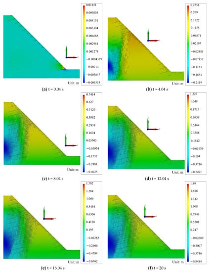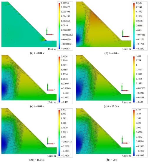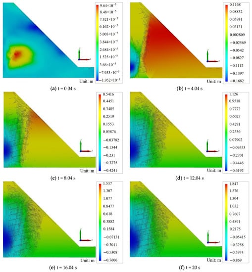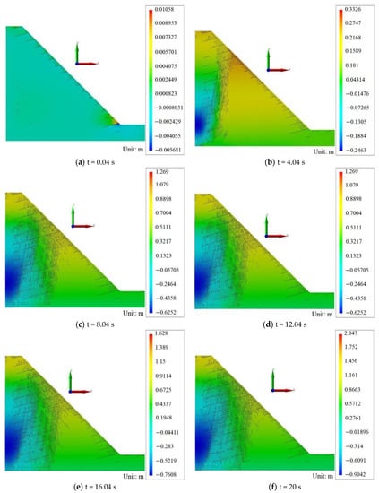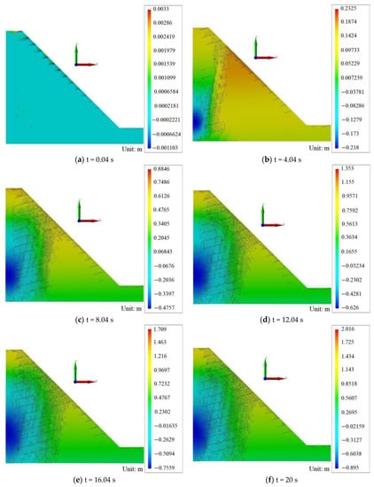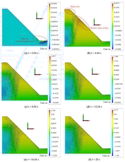 The displacement distribution of the slope under the loading of 0.5 g horizontal seismic wave is shown in Figure 8. Figure 8 shows that when t = 0.04 s, the initial damage first appears at the slope toe. With the continuous ground motion, the maximum displacement of the slope gradually appears in the shallow slope surface and the slope crest area. The maximum displacement of the slope is 2.173 m. Therefore, the slope toe, surface and crest have become the key areas of concern and potential deformation danger area. That is, these areas are also the key areas to be strengthened. Firstly, Case 2 was locally strengthened at the slope toe. When 0.5 g horizontal ground motion was applied, the displacement distribution of the slope is shown in Figure 9. Figure 9 shows that during the process of earthquake, the slope deformation and damage first appear on the slope surface, and gradually intensify with the increase in ground motion time. The maximum displacement of the slope after the first grouting reinforcement at the slope foot is about 2.016 m. The displacement of the model after the first reinforcement is significantly reduced compared with that before the first reinforcement.