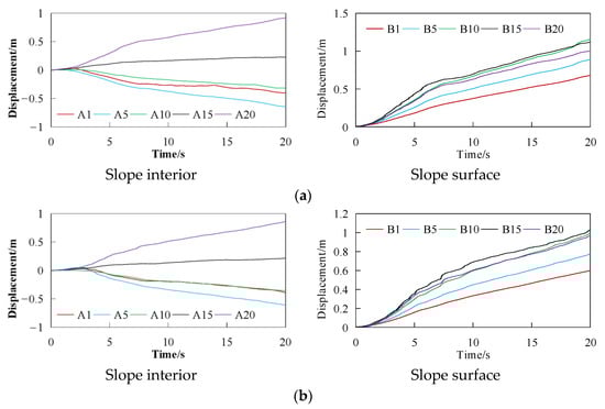 The failure of complex slopes is a gradual evolution process, which has the characteristic of being a gradual, cumulative damage evolution. In order to study the feasibility of the local precise reinforcement method of slopes under earthquake action, the three schemes of unreinforced, local precise reinforcement and overall reinforcement were compared and analyzed. The stability change characteristics of several models after reinforcement were discussed. Taking Case 1 (unreinforced model) and Case 3 (shallow local reinforcement of shallow slope surface) as examples, the displacement and acceleration time histories within the model and on the surface are shown in Figure 14 and Figure 15. Figure 14 shows that the peak ground displacement (PGD) in the slope and on the slope surface decreases to a certain extent after Case 3 is partially strengthened. Figure 15 shows that the peak ground acceleration (PGA) in the slope and on the slope surface decreases to a certain extent after Case 3 is partially reinforced. This indicates that the dynamic deformation of the slope decreases after local reinforcement and the reinforcement effect is better.