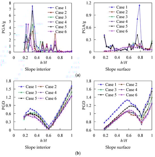 In Figure 16a, through the analysis of PGA changes in the slope interior and at the slope surface, it can be found that PGA presents irregular change characteristics. This is because there are many refraction and reflection effects when the seismic wave passes through the slope body, which leads to the extremely complicated propagation characteristics of the seismic wave in the slope, and then makes the PGA change characteristics in the slope very complicated. By comparing Cases 1–6, it was found that PGA of different models has obvious changes with the change of elevation characteristics. This indicates that local reinforcement and overall reinforcement change the distribution characteristics of the dynamic acceleration amplification effect of slope. In Figure 16b, through the analysis of PGD, it can be seen that the variation trend of PGD of different models is similar in the slope and the slope surface. On the whole, it increases first and then decreases, and then increases in the end. On the whole, PGD on the slope surface increased first, then decreased and finally increased. In general, PGD increases as the elevation increases, reaching its maximum value at the slope crest. By comparing the PGD of different slope models, it was found that local and overall reinforcement did not significantly change the variation trend of PGD.