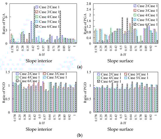 Moreover, the ratio of PGA (PGD) of the reinforced models (Case 2–6) to that of the unreinforced model (Case 1) is shown in Figure 17. Figure 17a shows that the PGA ratio of Case 6/Case 1 is significantly greater than that of other models, that is, the acceleration amplification effect after the overall reinforcement is significantly greater than that of the local reinforcement model. This indicates that the dynamic stability of the integral reinforcement is less than that of the local reinforcement, which indicates that the effect and feasibility of the local reinforcement are better. Figure 17b shows that the PGA ratio of Case 6/Case 1 is larger or similar to other models on the whole, indicating that the dynamic stability of the slope after overall reinforcement is less than or close to that of the local reinforcement model. This further shows that local reinforcement is effective and feasible.