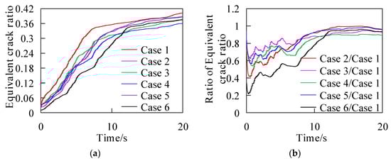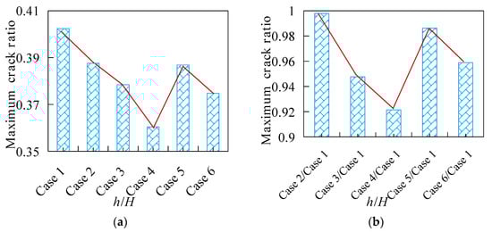Variation of the maximum equivalent crack ratio of Cases 1–6: (a) maximum equivalent crack ratio; (b) ratio of crack ratio under reinforcement conditions to that before reinforcement.