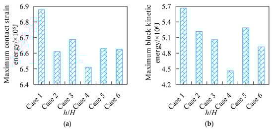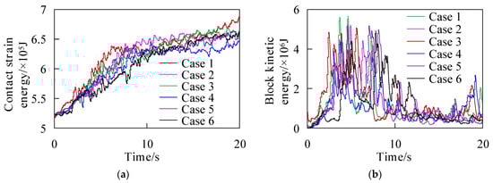In addition, in order to further explore the effect of the local precise reinforcement method and the global reinforcement method, the contact strain energy and block kinetic energy of different models are shown in Figure 20. The maximum contact strain energy and block kinetic energy of the slope are shown in Figure 21. Figure 20a and Figure 21a show that with the increase in ground motion duration, the contact strain energy between slope blocks gradually increases, and gradually becomes stable after t = 10 s. On the whole, the contact strain between blocks of unreinforced in model Case 1 is the largest, and the overall reinforcement in Case 6 is close to the local precision reinforcement model in Cases 2–5, indicating that the effect of the local precision reinforcement is close to that of the overall reinforcement. In addition, Figure 20b and Figure 21b show that the kinetic energy of the slope blocks is mainly concentrated at t = 3–10 s, which indicates that slope deformation and failure mainly occur in this period. Meanwhile, Case 1 has the largest block kinetic energy, and the kinetic energy of Case 6 and Cases 2–5 is similar, indicating that the effect of local precision reinforcement is similar to that of overall reinforcement.