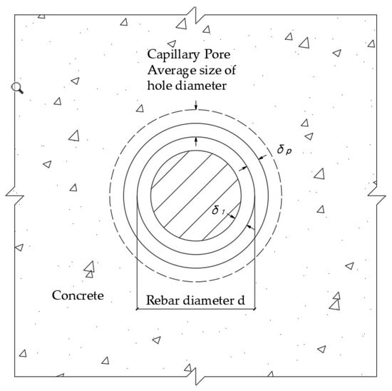 The depth of corrosion of the reinforcement in the free expansion phase of rust depends on the volume of the capillary pores at the interface between the reinforcement and the concrete. The volume of the pores at the interface between the reinforcement and concrete, i.e., the volume of rust filled into the capillary pore , can be converted into a uniform rust layer thickness at the periphery of the reinforcement, and can be further converted into the depth of corrosion of the reinforcement by geometric relationships. Assuming that the pores are uniformly distributed in the cement stone, it is known from Figure 2 that: