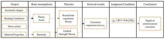 The rusting and cracking of the concrete protective layer caused by reinforcement corrosion is a random process, which is influenced by many factors, such as material strength, concrete strength, environmental factors, etc. From the way of generation, the influencing factors can be divided into man-made corrosion and natural corrosion, and this paper mainly considers its natural corrosion situation. Before conducting the theoretical analysis, we make the following basic assumptions. The basic flow chart is shown in Figure 3.