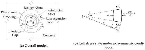The rust and swelling cracking model of the concrete protection layer shown in Figure 3 is a plane strain axisymmetric problem and is analyzed using the polar coordinate system. Considering the equilibrium of the unit force system, the equilibrium differential equation for the plane strain axisymmetric problem can be obtained as: