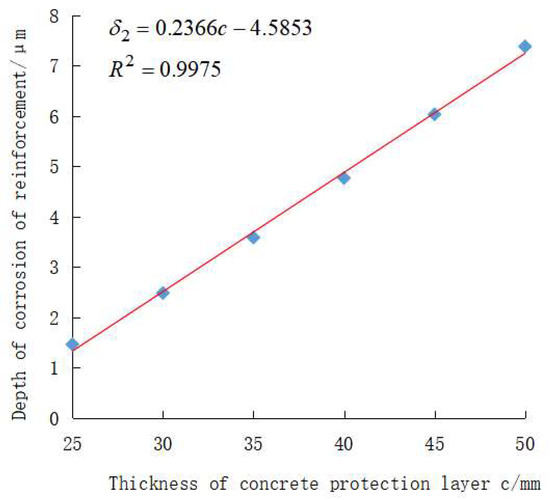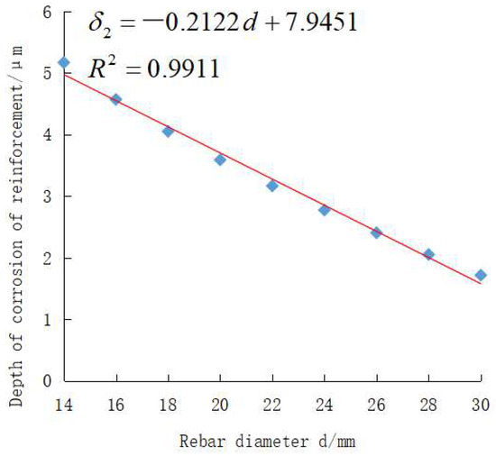 According to the theoretical calculated values and data fitting analysis, it can be seen that: (1) the reinforcement corrosion depth δ2 is approximately linearly decreasing with the reinforcement diameter; for every 1 mm increase in the reinforcement diameter, the reinforcement corrosion depth δ2 decreases by 0.2122 μm, with a linear decrease factor of 0.2122. The reason is that on the one hand, the reinforcement diameter increases and the rust expansion force of the concrete protective layer cracking caused by the reinforcement corrosion decreases (Equation (24)). On the other hand, the reinforcement diameter increases and the depth of rusting of the reinforcement needed to produce the same volume of corrosion products decreases. Therefore, the other conditions are the same; the use of finer diameter reinforcement is conducive to delaying the cracking of the concrete protective layer and improving the durability of reinforced concrete structures. (2) When the diameter of the reinforcement is greater than 37.44 mm, the relative protective layer thickness c/d < 1, the depth of reinforcement corrosion δ2 is less than 0, and the results of the theoretical calculation in this paper are no longer adapted.