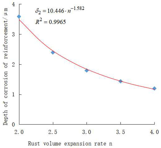 According to the theoretical calculated values and data fitting analysis, it is known that: (1) the depth of steel corrosion δ_2 and the rust volume expansion rate n are in an approximate power function relationship, the rust volume expansion rate n increases, the depth of steel corrosion δ2 decreases at the rate of n−1.582, showing the characteristics of a fast decrease in the early stage and a slow decrease in the later stage. (2) According to Formulas (25) and (26) after simplification, it is known that , where k is a constant, also conforms to the power function relationship. This is because the rust volume expansion rate increases—the same volume of steel corrosion occurs in the rust products increase—resulting in a simultaneous increase in the rust expansion force, so that the concrete protective layer cracking moment at the depth of the corrosion of the reinforcing steel decreases. Therefore, in engineering design and application, the use environment should be taken into consideration to avoid the generation of corrosion products with high volume expansion rates as much as possible, so as to improve the durability of reinforced concrete structures.