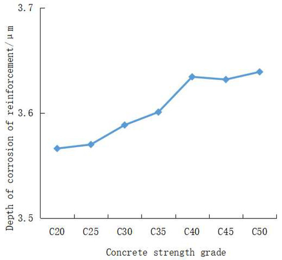 The concrete strength class determines the parameters , , , and in the model, which effect the reinforcement corrosion depth . The following calculation parameters were used: concrete C30,, , and , to analyze the effect of the concrete strength level on the depth of reinforcement corrosion, as shown in Figure 7.