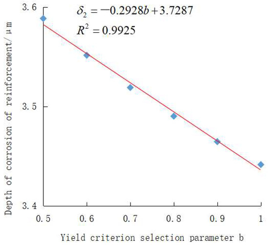 According to the theoretical calculated values and data fitting analysis, it can be seen that the reinforcement corrosion depth δ2 is approximately linearly decreasing with the yield criterion selection parameter b. For every 1 increase in yield criterion selection parameter b, the reinforcement corrosion depth δ2 decreases by 0.2928 μm, with a linear decrease factor of 0.2928 and a large decrease rate. However, for concrete materials, the value of b ranges from 0.5 to 1, so the overall change is small, within 0.15 μm. To be safe, it is recommended to adopt the double shear strength criterion at b = 1 as the yield criterion for concrete.