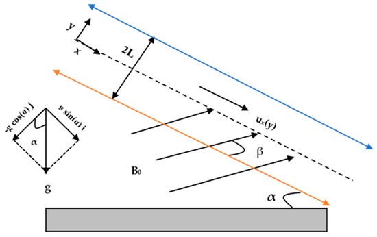Take into consideration a couple stress fluid flowing steadily along an infinitely long inclined channel that is inclined at an angle from the surface where irreversible heat transfer occurs. The channel has a height of with stable walls on either side. A uniformly inclined intensity magnetic field is provided at an angle to the direction of the fluid flow. The fluid runs through the force of gravity and pressure gradient. At the lower and upper walls, the temperatures were obtained as and respectively, where . According to Figure 1, the Cartesian coordinate system has been set up so that the x-axis runs parallel to the direction of the fluid flow and the y-axis runs perpendicular to it.