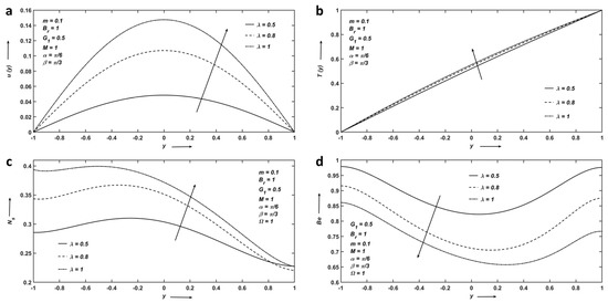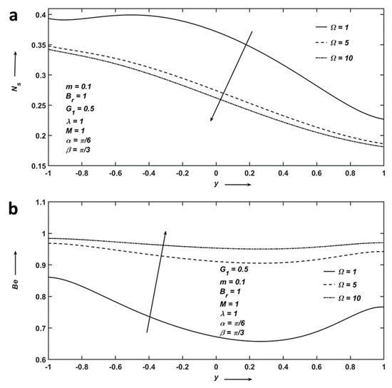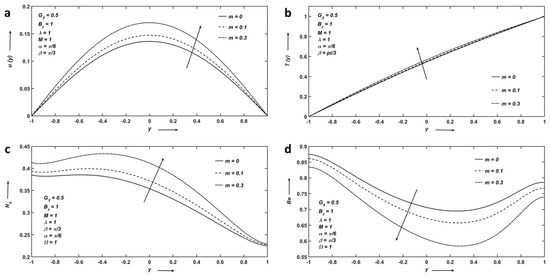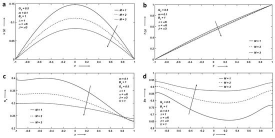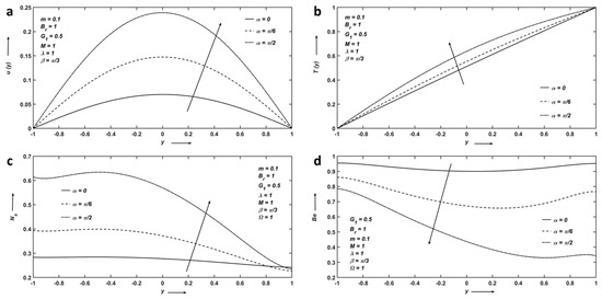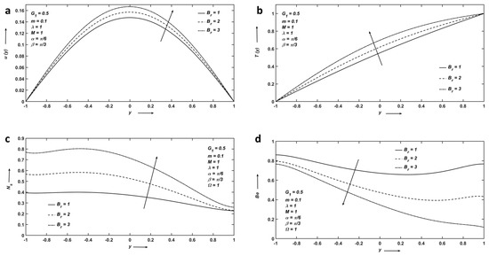 Figure 5a–d represents the variation of the viscosity parameter . Figure 5a shows that with an increase in , a velocity profile reaches its maximum at the centerline of the channel and decreases at the vicinity of both plates. Figure 5b portrays that the higher the value of , the larger the viscous dissipation, and hence, the temperature increases. Figure 5c shows that entropy enhances as increases around the centerline. It can be seen that fluid friction predominates close to the upper surface of the channel, whereas irreversible heat transfer prevails around the centerline. The influence on is displayed in Figure 5d.