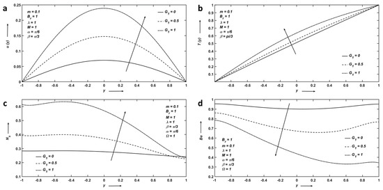 Figure 7a–d represents the variation of pressure gradient parameter . Clearly, the velocity and temperature distributions increase as increases. Figure 7c exhibits that as increases, entropy increases because the fluid friction irreversibility dominates and then declines gently around the upper surface of the channel. In Figure 6d, declines because the higher the value of the stronger the fluid driving force, which increases the irreversibility due to fluid friction, and therefore, drops.