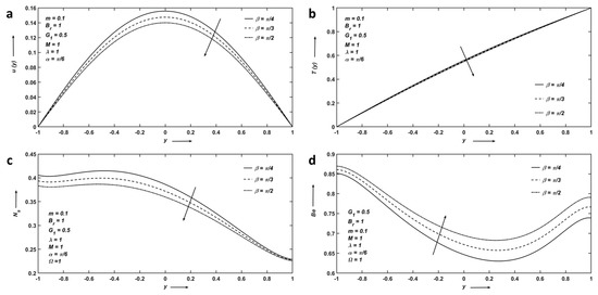 (a) Velocity; (b) Temperature; (c) Entropy; and (d) Bejan number profiles affected by angle of inclined magnetic field.