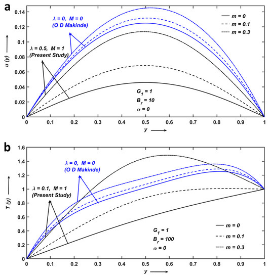Comparison between present study and O D Makinde [32] for (a) velocity and (b) temperature profiles on the non-dimensional viscosity parameter m.