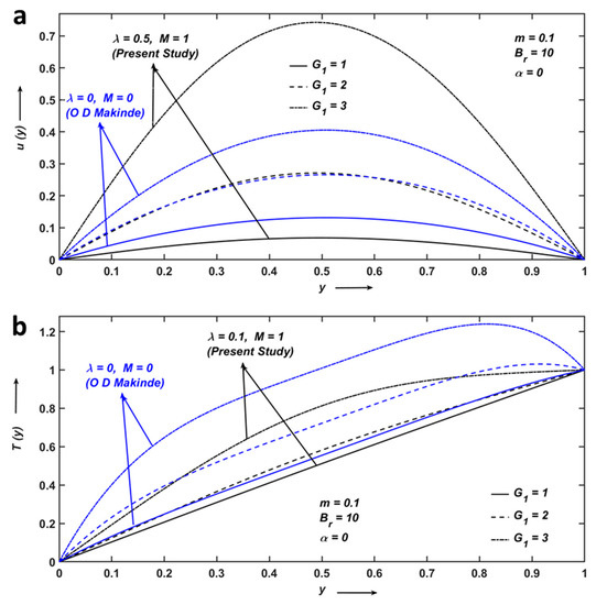 Table 1 summarizes that the results of the present study for M = λ = 0 can be compared with the existing results of O D Makinde. The present results of velocity and temperature are found to be consistent with the previous study regarding all considered values of the Brinkman number. The table shows the comparison values for and at y = 0.5, and both distributions increase by varying the values of Br because the greater the value of Br the higher the heat production produced by viscous dissipation, and therefore, the increase in velocity and temperature.
