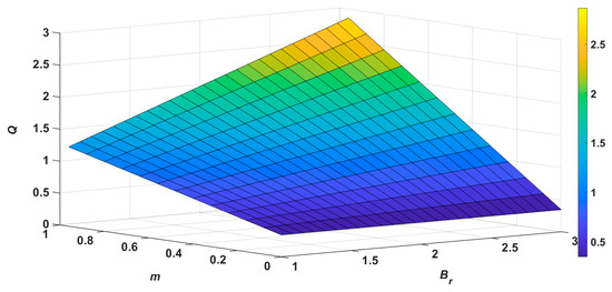Figure 9a–b exhibits the variation of the temperature difference parameter. Figure 9a depicts that entropy decreases as increases because fluid friction irreversibility dominates, which reduces the flow rate, and hence, entropy decelerates. Figure 9b shows that the Bejan number increases due to a reduction in the effect of fluid friction irreversibility.