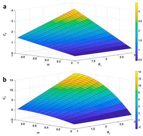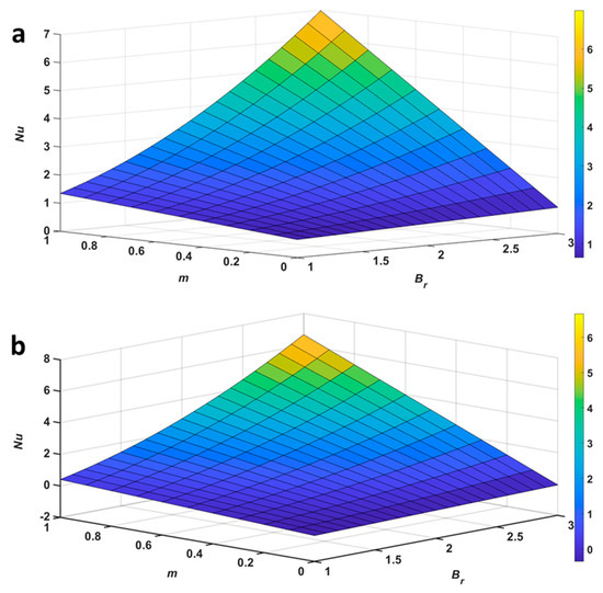 Figure 12 shows that the rate of the volume flow increases as and increase because heat generation by viscous dissipation increases, which yields an enhancement of the volume flow. In Figure 13a–b we observe that when both and simultaneously increase and when one of the parameters varies while the other remains constant, then the velocity is enhanced, which increases the friction between the surface and the fluid flow, and hence, skin friction at both the surfaces of the channel increases. Figure 14a–b depicts that when both and simultaneously increase, and when one of the parameters varies while the other is constant, then the Nusselt number at both the surfaces of the channel increases because the temperature gradient rises, and thus, heat transfer irreversibility due to convection is more dominant.