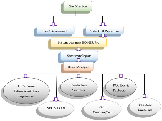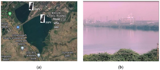 This section deals with the site selection (BSP), the availability of solar global horizontal index (GHI) resources at the site and the system modelling. BSP is located at 21°10.7 N latitude and 81°23.4 E longitude 319 m above sea level. BSP, headquartered in Bhilai, Chhattisgarh, is the country’s first and largest producer of steel rails, as well as a major producer of wide steel plates and other steel products. It also manufactures steel and sells various chemicals by-products produced by its various sections. It was founded in 1959 with the assistance of the Soviet Union [30,31,32,33]. It has various sections, such as a blast furnace, steel melting shop, coke oven and rail mill, among which two—namely, the BSP oxygen plant (BSP Oxy Plant) and BSP plant operations (BSP Plant Operat)—were selected for simulation and analysis. BSP currently operates with a grid-only system, purchasing power at USD 0.100/kWh. BSP has two main reservoirs named Maroda Reservoir-1 and Maroda Reservoir-2 within its plant area, as shown in Figure 2. Maroda Reservoir-1 is not used by BSP, whereas Maroda Reservoir-2 water is used for the treatment processes in some plant operations. Presently, there is no generation system installed in either of these two reservoirs. The data for the two reservoirs were obtained from BSP for further research evaluation and demonstrated that they have a high potential for the generation of power with an FSPV system. As a result, the authors of this study proposed an FSPV–grid system for these two reservoirs. Figure 3 shows the step-wise methodological flow chart adopted for the research.