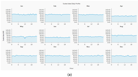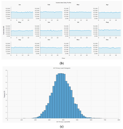 The load profile included two plant loads; the first load was the BSP oxygen plant, which is capable of supplying 265 litres of medical oxygen per day in Chhattisgarh and eight other states in India [34]. This plant has acted as a lifeline during pandemics in previous years. The second load was BSP plant operations, which include the lighting, fans, air conditioning and various mechanical loads involved in steel production. The hourly load profiles for both loads for the months of the fiscal year 2021–2022 are shown in Figure 4a,b, whereas Figure 4c shows the histogram profile for both loads.