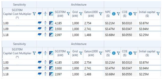 HOMER Pro was used to perform various technical and economic simulations based on the grid-only and proposed FSPV–grid systems for BSP and its inputs. The FSPV nominal value (1%) and price hikes of 9% and 18% were considered for the simulation process since the maximum percentage increase up to the first quarter of 2022 was 18%. For each percentage increase in the sensitivity inputs, many solutions were obtained by HOMER Pro, out of which several were feasible. The criteria selected for defining the results were: