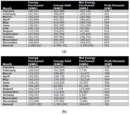 (a) Screenshot of HOMER Pro results for energy purchased and sold in FSPV–grid system for 9% PV price hike. (b) Screenshot of HOMER Pro results for energy purchased and sold in FSPV–grid system for 18% PV price hike.