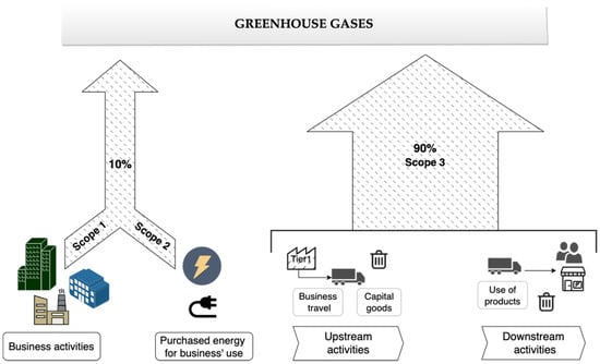 On average, 10% of business-related GHG emissions are classed as scope 1 and scope 2, while 90% are associated with scope 3 emissions [20]. The three scopes classification is a way to categorise the various types of emissions that a business creates during its operation and across its entire value chain [21]. The term “scope” was assigned by the Greenhouse Gas Protocol, which has developed internationally accepted standardised frameworks to enable the management and measurement of GHG from businesses’ value chains [21,22]. Scope 1 emissions come from business activities (e.g., emissions from the company’s facilities and/or from the company’s vehicles and equipment), and Scope 2 is from purchased energy for business use (e.g., heating, cooling, electricity) [23]. Scope 3 emissions are indirect industry emissions that are generated during upstream business activities (e.g., capital goods, business travel, transportation and distribution of the product between tier 1 supplier and company, waste produced from upstream phases), as well as downstream business activities (transportation and distribution of products between company and end consumer, use of products, waste produced from downstream operations, end-of-life management of products) [23]. Figure 1 shows the main sources of scope 1, 2, and 3 emissions. Given that one of the principles of a CE is designing out waste pollution and emissions generated pollution, circular solutions along the entire built environment industry value chain will lower scope 1, 2, and 3 emissions [20].