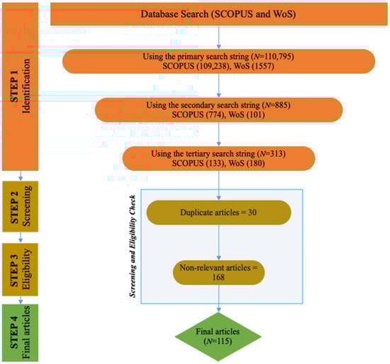 The articles found on both databases that met these criteria were exported for further analysis. Next, duplicated records were cleaned up. After this, the abstract, title, and keywords were carefully assessed. Those articles deemed irrelevant were excluded. For instance, some papers were focused on health risks from construction materials, marketing, or wastewater. Figure 3 gives an overview of the articles’ screening and selection process.