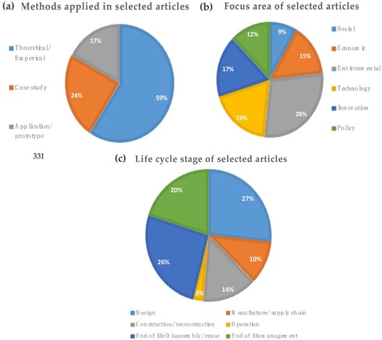 Figure 5a shows that research on current CE practices in the built environment has had a dominant theoretical focus rather than a practical one. Around two-thirds of the selected articles applied theoretical methodologies (literature reviews), while case studies and prototypes accounted for 22% and 13%, respectively. Figure 5b illustrates that technology, innovation, and environment are the most studied areas in the selected articles (between 22% and 23%). Less focus is given to economic (13%), policy (11%), and social (9%) aspects. Figure 5c gives an overview of the life cycle stage that the selected articles cover. The EoL stage makes up 42% of the research, with 22% addressing the EoL through processes such as disassembly and/or reuse, and 20% of the articles focus on the EoL from the waste management perspective. Nearly a quarter of the articles address the design stage, which is followed by both the construction and manufacture stages, at 18% and 15%, respectively. Interestingly, only 1% of the articles discuss the operation stage, showing a gap in research.