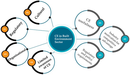 The application of the meta-analysis to the collected data served to identify the key barriers to implementing the CE in the built environment sector in Australia (Figure 6). The results suggested four key clusters of barriers: cultural, regulatory, organisational, and knowledge and understanding. The literature examined in this section covers both Australian and other countries’ sources.