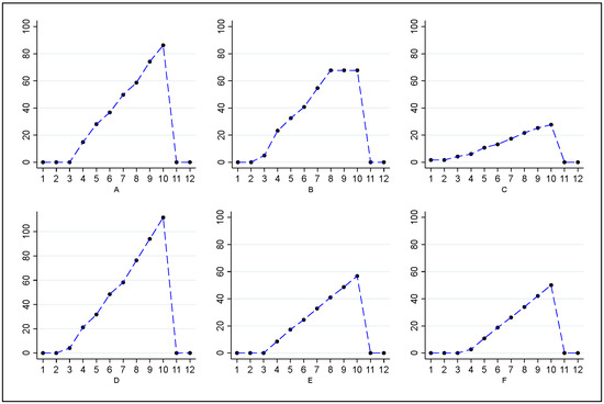 Monthly clinker outputs of six clinker firms in the year of 2015 (unit in ten thousand tons). Each panel represents a clinker firm. (A) is Shuangyashan New Era Cement Co., Ltd.; (B) is Yichun North Cement Co., Ltd.; (C) is Liaoning Fushun Cement Co., Ltd.; (D) is Liaoning Fushan Cement Co., Ltd.; (E) is Yatai group Tonghua Cement Co., Ltd.; (F) is Yatai group Yitong Cement Co., Ltd. Figure 1 shows that monthly cement output abruptly drops to zero from January to March and from November to December in 2015, when the clinker production was prohibited by the COPP. Data are from WIND database.
