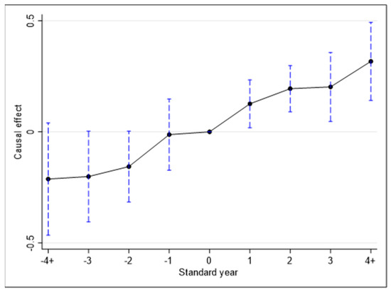 The premise for employing a DID model is that the common trend assumption should be satisfied. Here, we examine the dynamic effect of the COPP on residents’ health statuses via Model (2). Figure 2 shows the results. Figure 2 visualizes the dynamic effects of the COPP on health level, using the standard year zero as the reference, where the black line connects the estimates and the blue line indicates the 95% confidence intervals. The corresponding coefficients are estimated using Model (2). The coefficient of the COPP remains negative before the standard year and insignificant in the first two periods, which indicates that there is no significant difference in pre-trends between the treatment group and the control group, and the common trend assumption is satisfied. Meanwhile, the coefficient after the stand year becomes positive and stays significant throughout the year. The common trend assumption test supports the main conclusion of this paper.